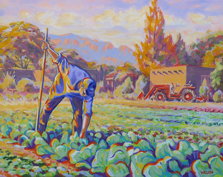 Among my frequent subjects are the farmers of Corrales and Albuquerque’s North Valley. I am interested in the gardener at work, the figure as a part of the landscape, humankind in harmony with nature. As an ardent naturalist and birder, I have traveled to wild habitats around the world, recording my observations in watercolor studies.
