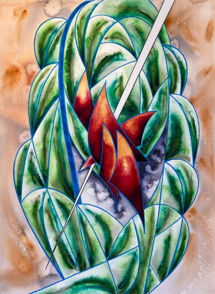 Most recently, my spiritual influences have led me deeper into abstraction. Focusing on the line, the color, the shape, the overall impression and the ultimate image has pushed me toward complete abstraction. No longer do I try to copy or paint an object. I don’t want to make a picture of something. Color is no longer just for coloring. Color becomes part of the form itself. Line is no longer the guide to painting a shape. Line becomes part of the form itself. Color and line create the shape and dimension. I want the painting to be defined by the viewer’s imagination. I want the viewer to find his/her imagination in my form, color and shape. I hope that you enjoy joining me on this adventure.