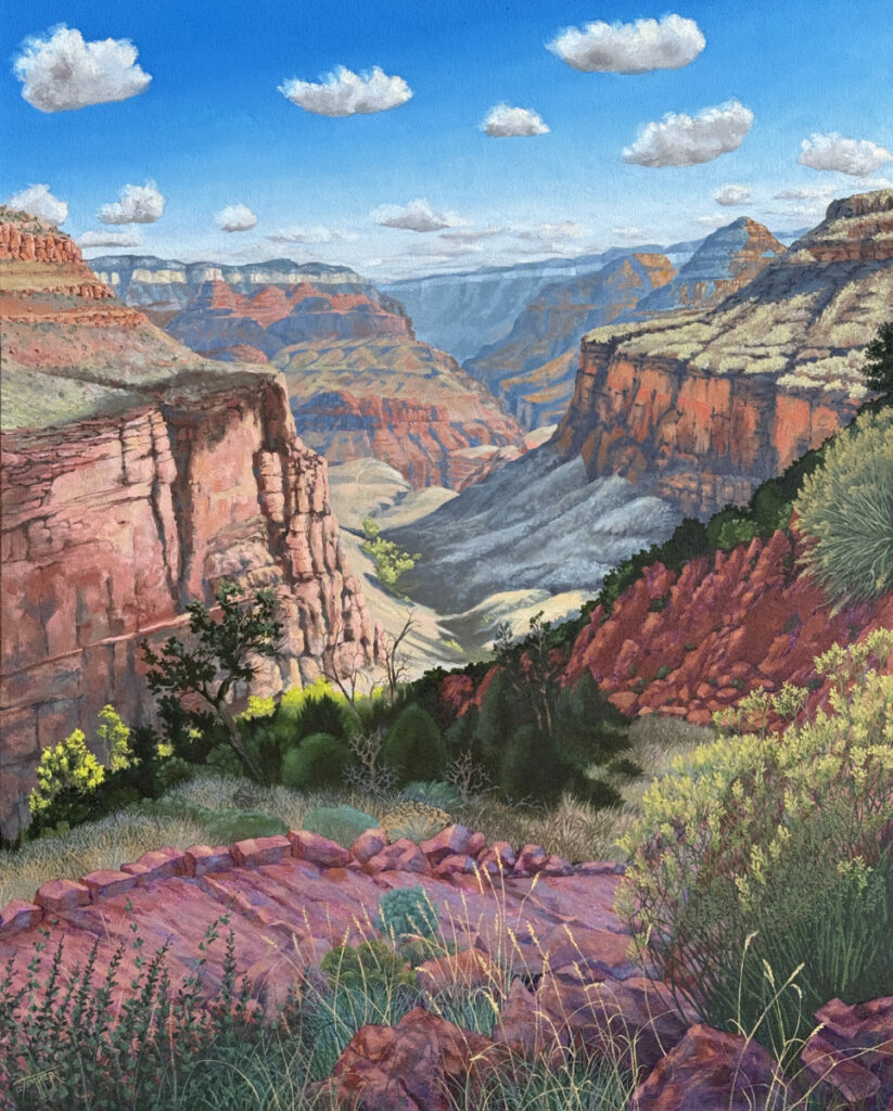 Oil paint, watercolor and pencil have always been my choice of media to reflect the world around me. Today, my oil work is based around the Grand Canyon. Drawn from photos I’ve taken while inside.
